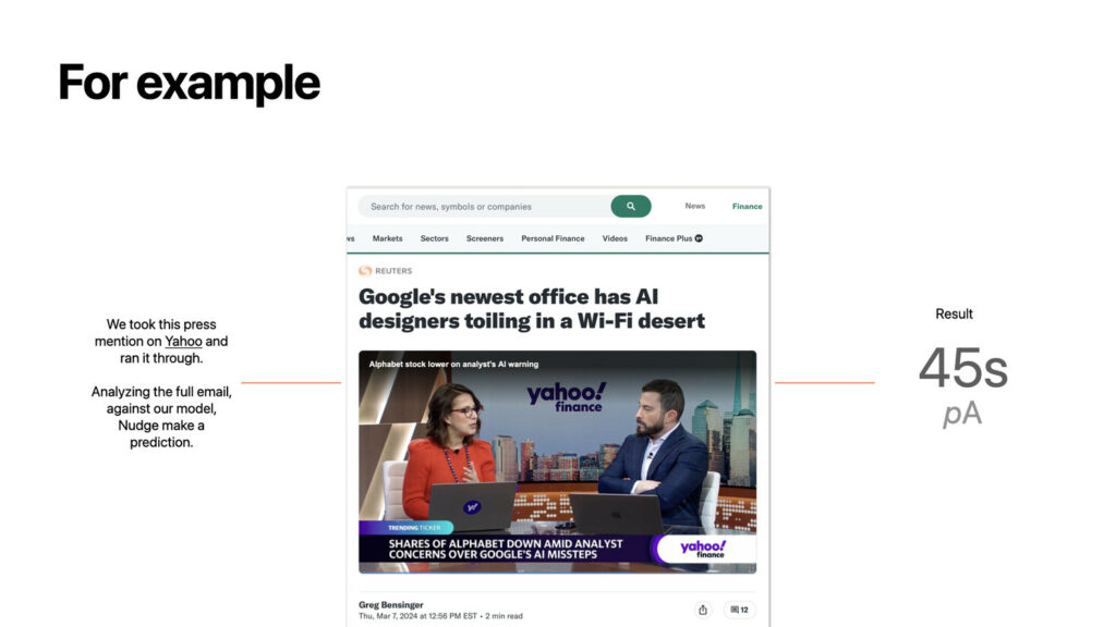 In this example a write up on Google has garnered 45 seconds of attention. This is arrived at through a Machine Learning model. Machine learning models help rapidly analyze large amounts of data to learn about their behaviors. Then to take those learnings and apply them cases where you have less data. In this case, earned media.