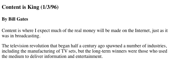 | Now if that isn’t timeless. I could put that in any presentation and date it 2020 and no one would bat an eyelid. Sumner did popularize the term, referencing competitors’ focus on distribution mechanisms but he believed the best content would always endure. In hindsight this makes sense, but it is a narrative that is on a repeat cycle. Distribution or content. Then in 1996 along came Bill Gates who penned the essay: Content is King, which is where we see it most referenced. Bill saw that content being delivered over the internet was an inevitability 24 years ago. |