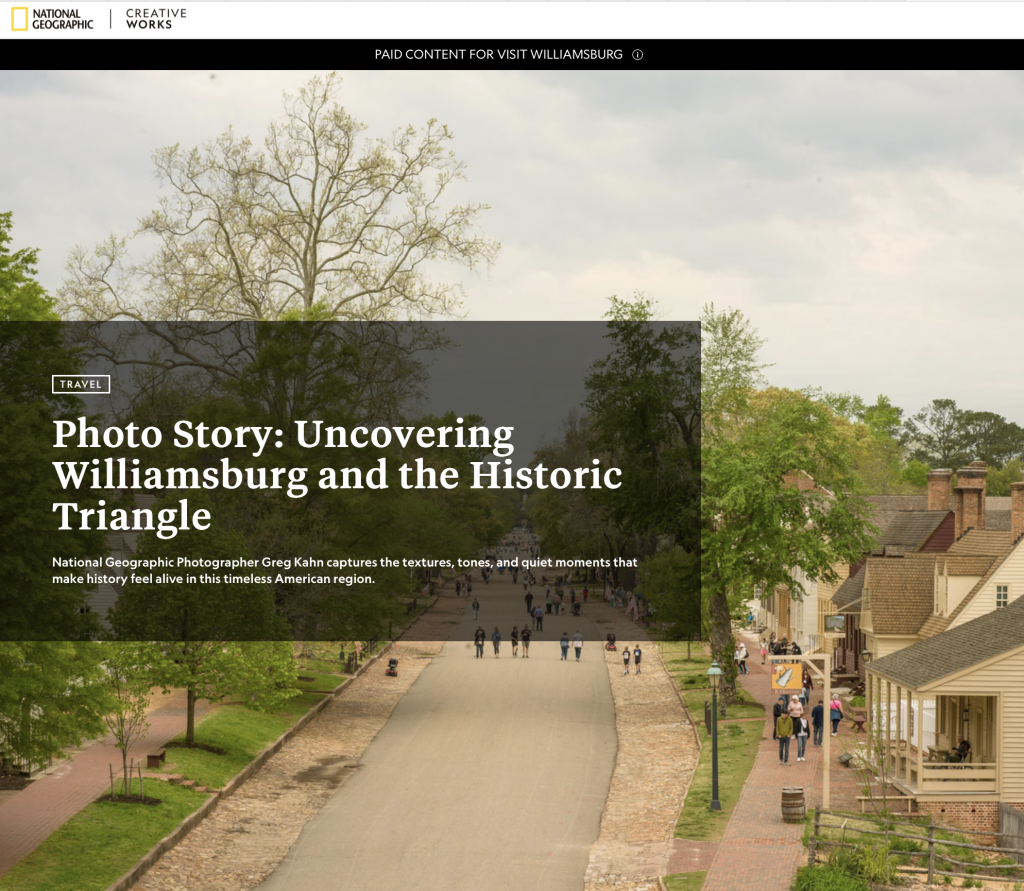 - Visit Williamsburg with National Geographic. Classic bread & butter work, reach an audience who want to travel, give them a reason to consider your destination.