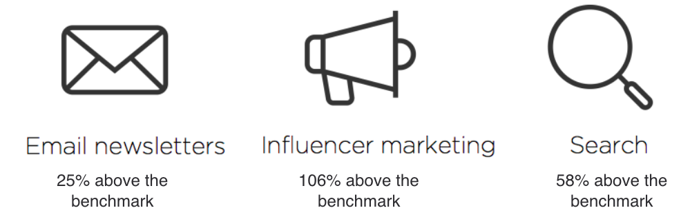 You might expect social to be the best channel for this, but Nudge data shows that social traffic performs 40% below the Nudge benchmark (surprising to many!). Influencer marketing, email & search are all driving better results, i.e. indexing higher than the benchmark, as you can see in the image below.