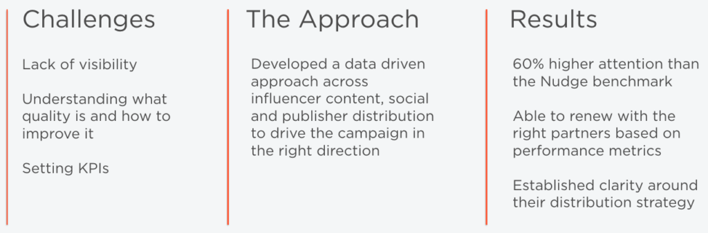 Based on accurate performance metrics, Nudge was able to help Spark Foundry make an informed decision on which partners to renew with, which distribution tactics to pursue, whilst at the same time putting them in the driving seat when it came to producing quality content (based on attention).