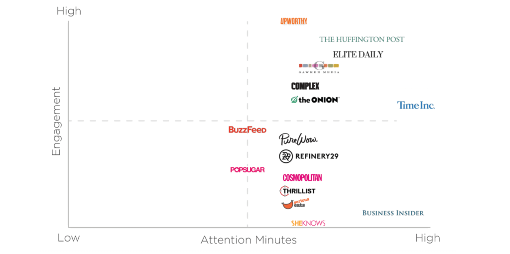 Upworthy is the top publisher within this category. It’s followed by Huffington Post, Elite Daily, Gawker Media, Complex, The Onion and Time Inc.