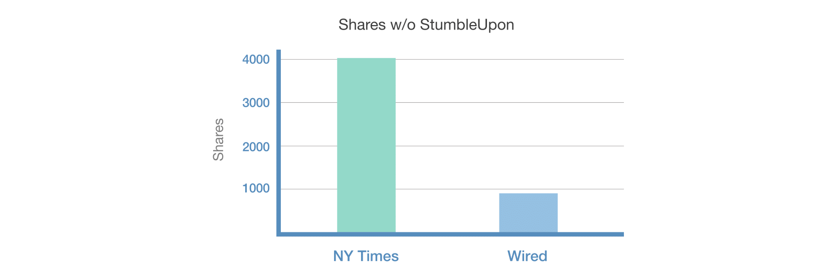 Overall, Wired had substantially more shares than the New York Times. However, 99.4% of those shares were from StumbleUpon, reflecting the nature of the Wired audience.