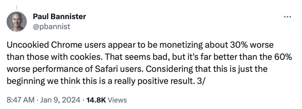 And there is huge motivation! Now that Google has removed third party cookies for 1% of users, we can peek at what’s going on. Paul Bannister from Raptive shared some early data on how the uncookied Chrome users were performing,