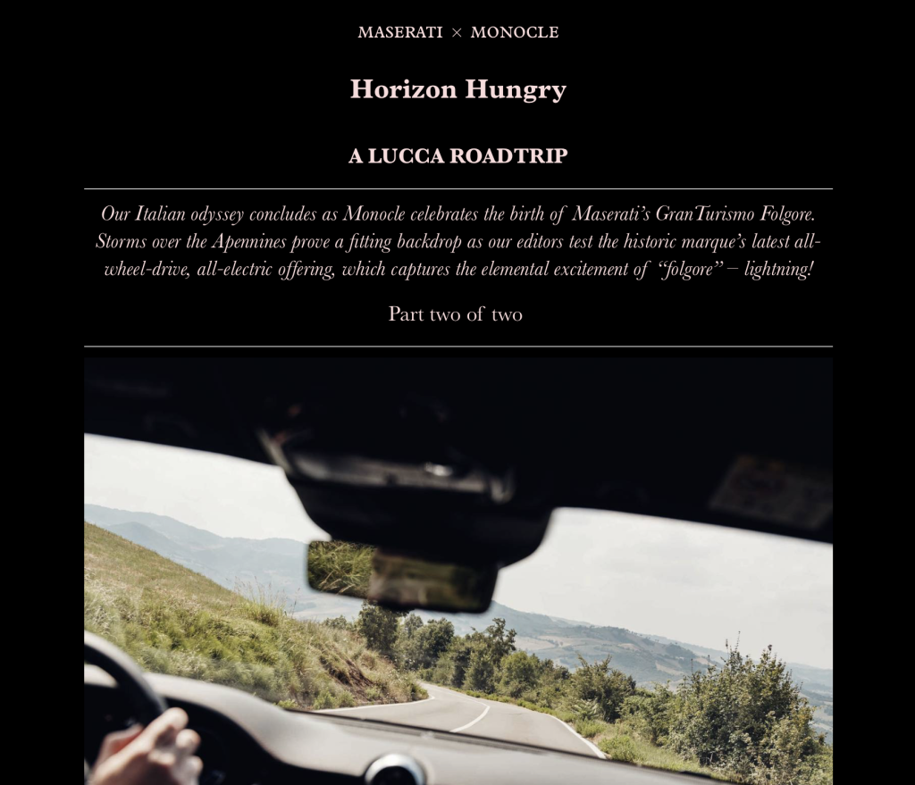 - The exact way you should learn of the new electric Maserati, within the confines of a Monocle road trip.